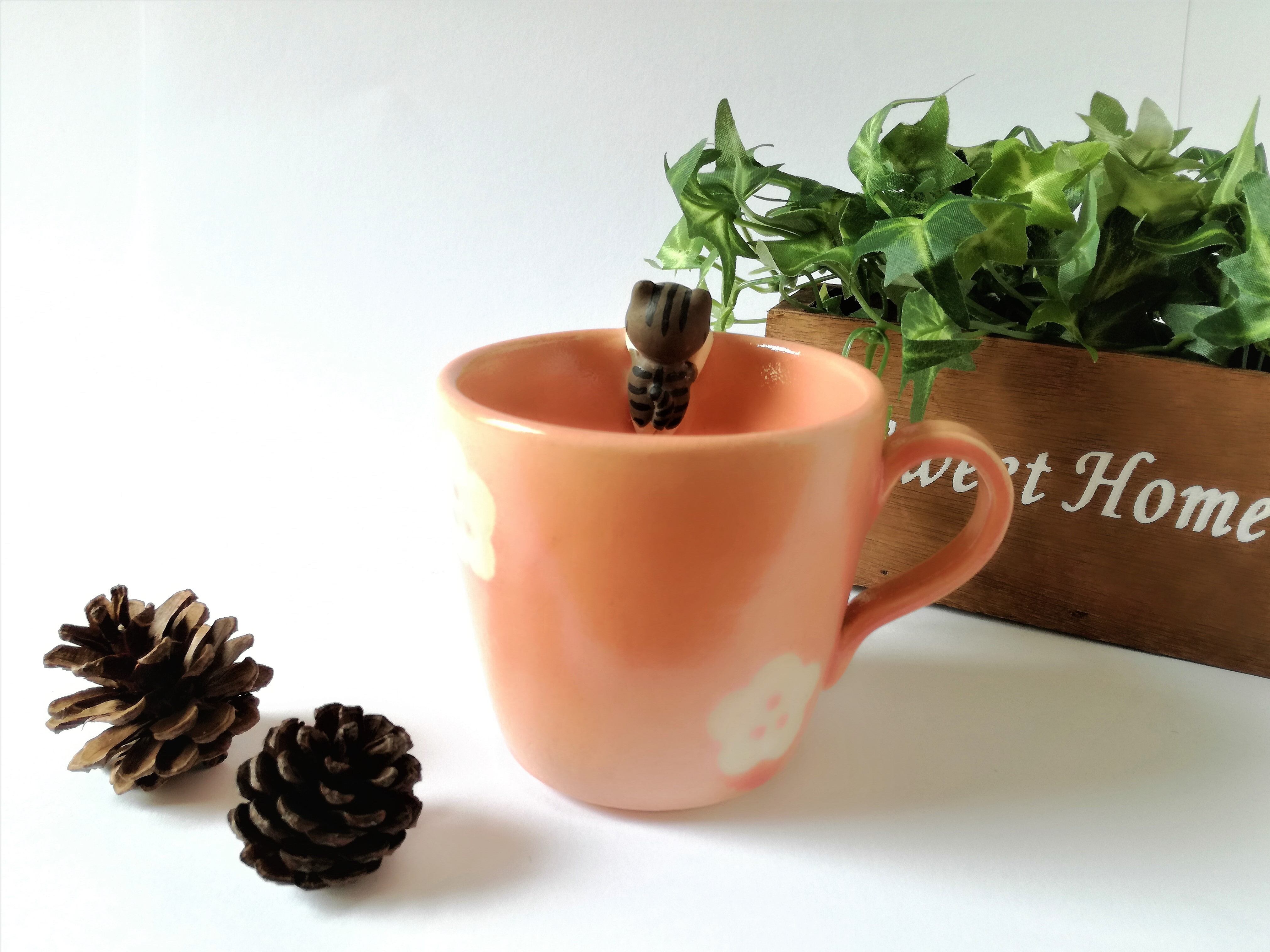 きじとら猫がくっついたカップです。ふんわりかわいい桃色の器の表面には、白い花の模様を施釉してあります。